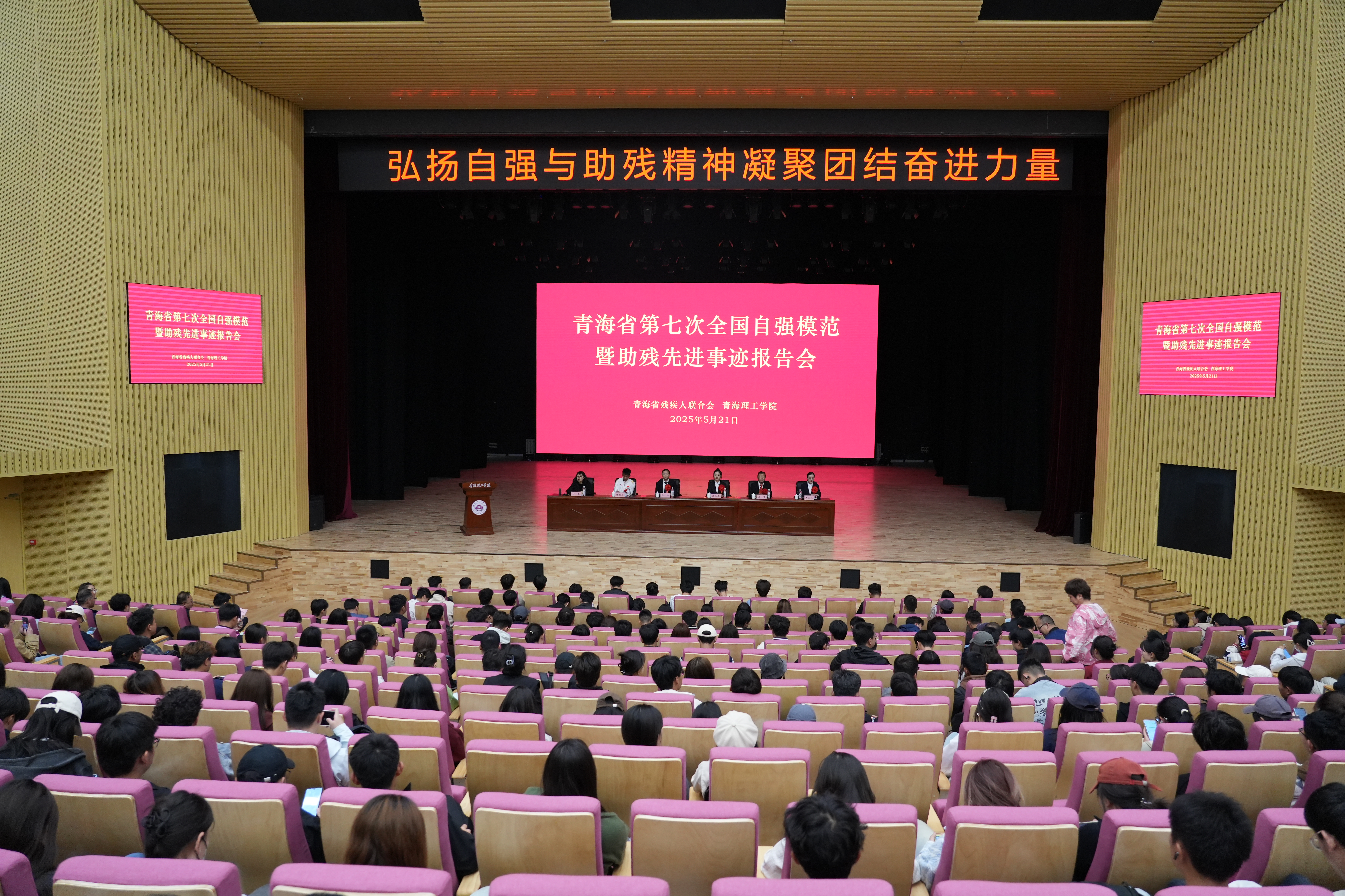 青海省民和县残联专职委员赵国存、青海师范大学副教授陈浩、青海省残疾人就业服务指导中心九级职员韩卓恩、海南藏族自治州残疾人综合服务中心分管领导吴贤、青海省残疾人康复服务中心康复教师严花兴等5名全国自强模范、全国残疾人工作先进集体及先进个人代表,与师生面对面分享奋斗故事、传递大爱精神,以实际行动让“自强不息”的种子在学校生根发芽、让“扶残助残”的火炬薪火相传,激励全体师生以榜样为镜、与时代同行,凝聚起团结奋进的青春力量。
