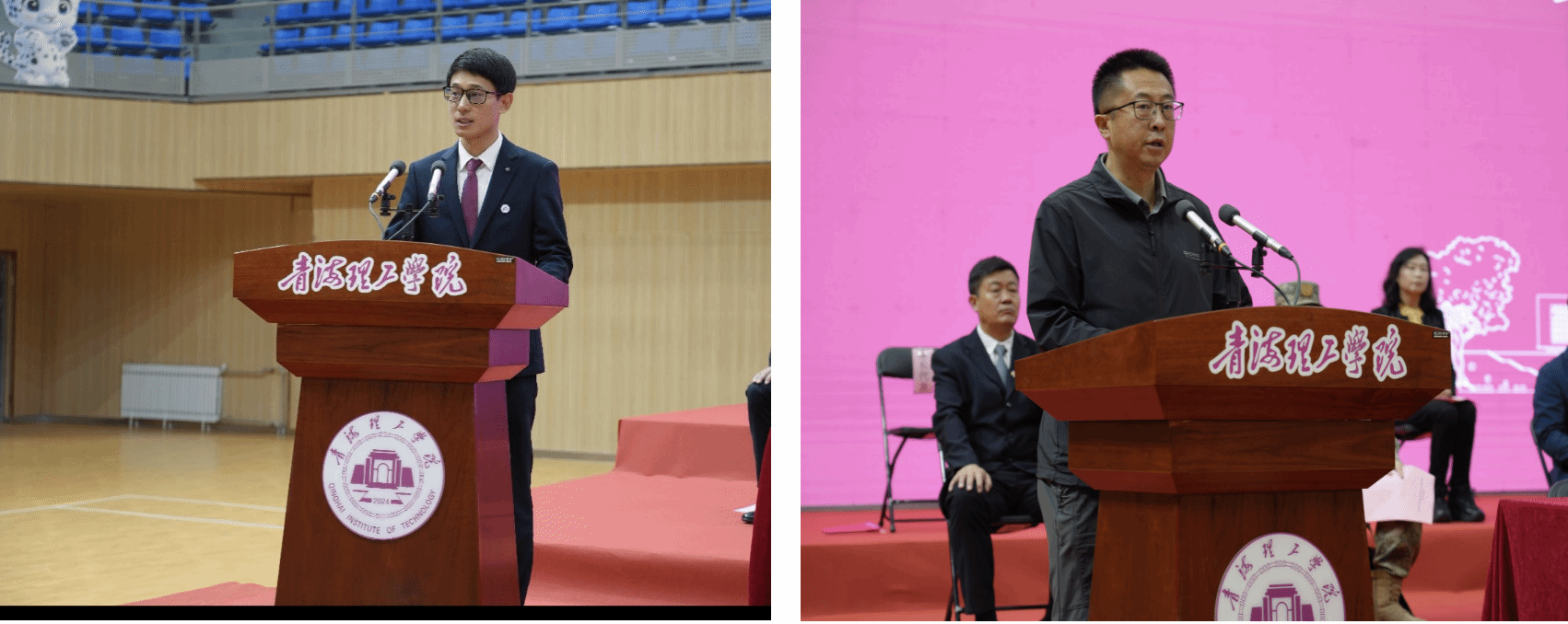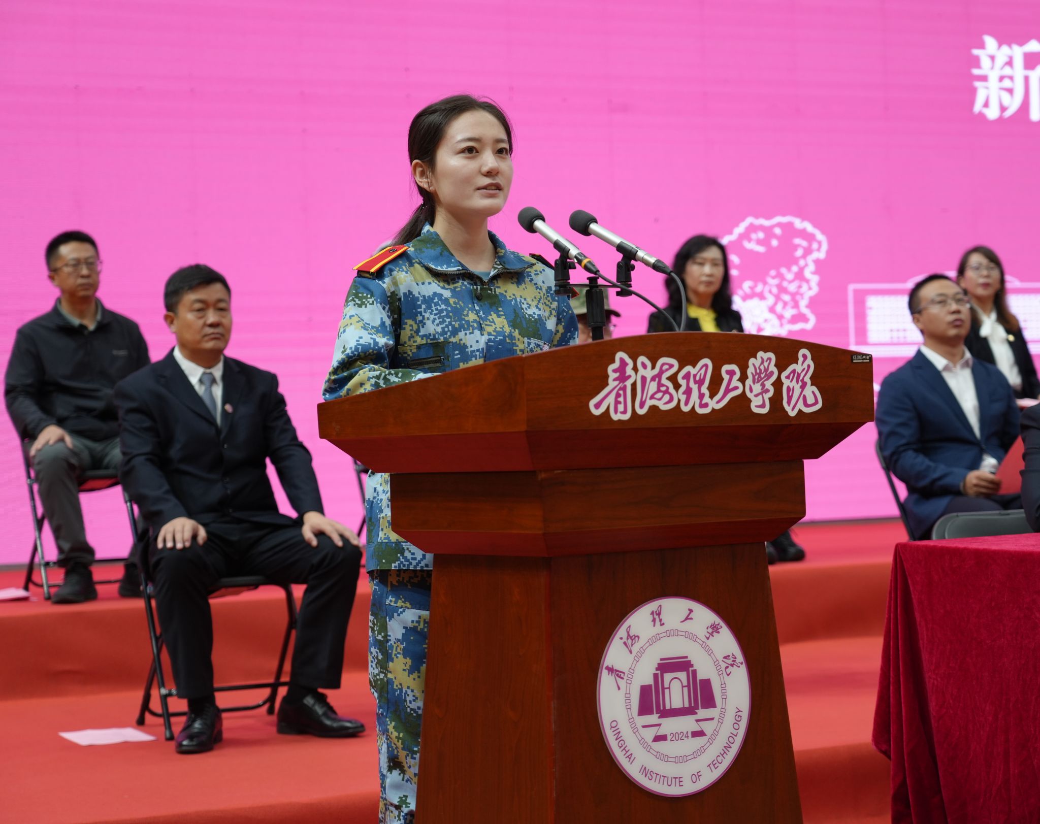 校学生会主席董慧洁同学代表学长作了发言,她结合自己入校一年的学习和学生工作经历,寄语学弟学妹要将个人成长与学校发展、国家需求紧密相连,保持好奇、坚守勇气,在奋斗中实现人生价值。新生代表陈树民同学表达了对大学生活的憧憬与期待,她表示将积极践行“崇德明理,博雅精工”校训,做心怀家国、勤奋学习、勇于实践的新时代青年,用所学知识助力青海建设、守护高原生态。