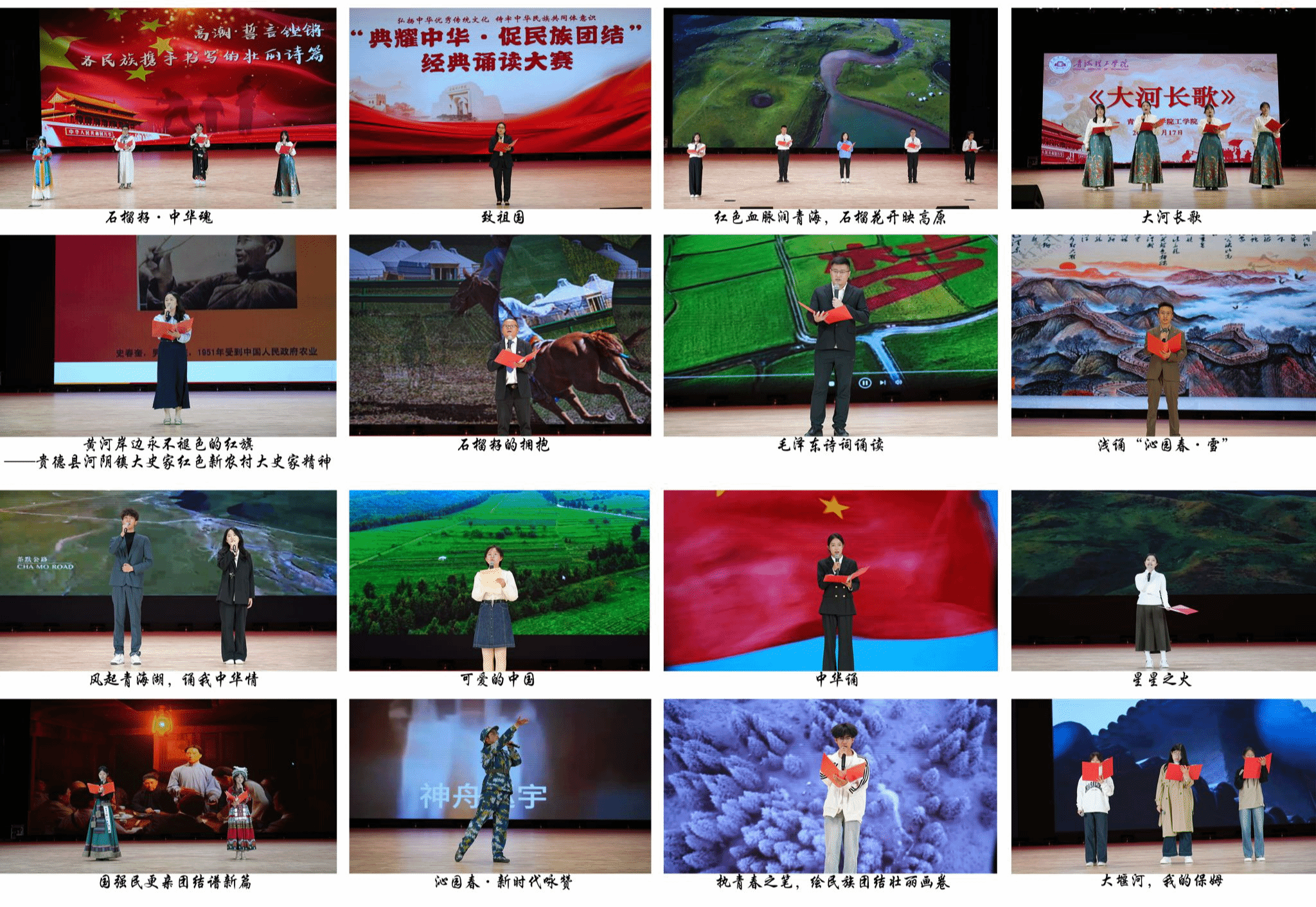 经过前期各部门、学院(中心)的广泛动员和初赛选拔,教师组及学生组共计16项作品进入决赛。他们的诵读或慷慨激昂,或深沉婉转,充分展现了中华经典文化的无穷魅力,生动表达了对伟大祖国、中华民族、中华文化的热爱之情,奏响了民族团结进步的和谐乐章。