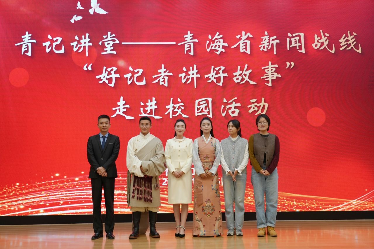 巡讲环节,七位来自青海、海北州广播电视台和西宁市、黄南州、玉树州、祁连县融媒体中心的优秀记者,结合自身工作经历,分享了多个感人至深的故事:程格记者以《童心越山海 千里送大爱》为题,生动地展现了积石山6.2级地震中两位小学生穿越万里的爱心传递,体现了中华民族传统美德传承弘扬。朱晓宁记者分享玛尔挡水电人远离家乡、克服恶劣环境,用绿电服务经济社会发展的故事。蒋莹记者《从 “酸啾啾” 到“金果果”》的故事,讲述了沙棘产业从无到有,将科技成果转化成新质生产力的过程。德吉记者讲述了金银滩草原上三位老兵故事,诠释责任与担当的奉献精神。裴赟记者讲述了黄南州刺绣与剪纸技艺传承人扎根农村、服务乡亲的拼搏精神。旦周尼玛记者分享了雪域高原孩子对足球热爱和执着、足球成就梦想的故事。王建国同志从祁连山两位生态管护员工作出发,讲述了生态环境保护、牧业绿色转型取得的成就。一个个鲜活的故事,不仅展现了新闻工作者的职业魅力与责任担当,更生动诠释了新时代青海人的精神风貌。记者们用生动的语言、真挚的情感,带领现场师生走进一个个平凡而伟大的灵魂深处,引发了强烈共鸣。